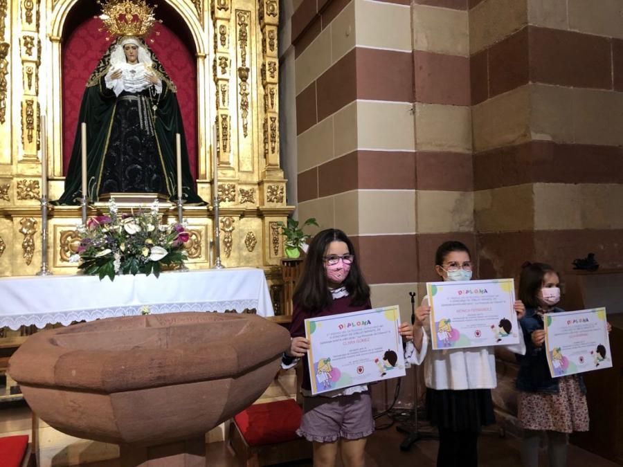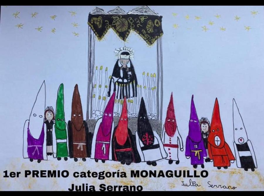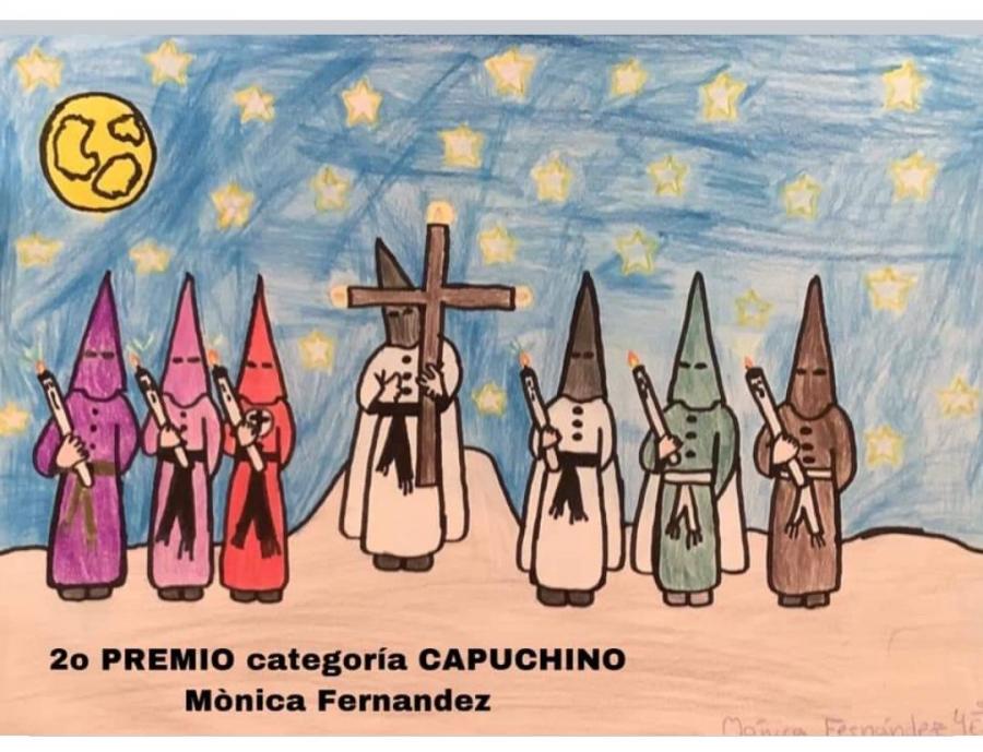 De entre más de 80 dibujos presentados por escolares de toda nuestra localidad y de las dos categorías que participaban ("monaguillo" y "capuchino"), Julia Serrrano (1º de Primaria), Mónica Fernández (4º de Primaria) y Clara Gómez (5º de Primaria), han obtenido los siguientes premios en sus categorías.